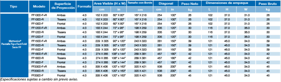 Pantalla FF 152 x 203 cm, Serie FF, Formato 4:3, 60" x 80" pulg., Diagonal 254 cm, 100"pulg., Mod. FF100D-F Proyección Frontal - Mattweiss |